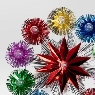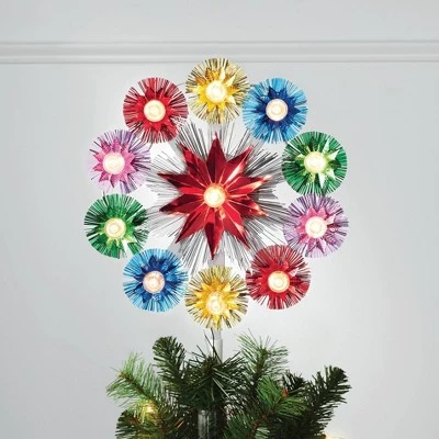 Add a playful element of color and shine to the top of your tree with this Pre-Lit LED Tinsel Star Christmas Tree Topper Rainbow from Wondershop™. This colorful Christmas tree topper features a bright red star that’s surrounded by silver tinsels and circular tinsel accents for a cheerful look. This fancy seasonal accessory comes pre-lit with many LED lights to cast a sparkling festive glow. Add this decorative tree topper to your holiday tree in your entryway, living room or family room to bring some Christmas .