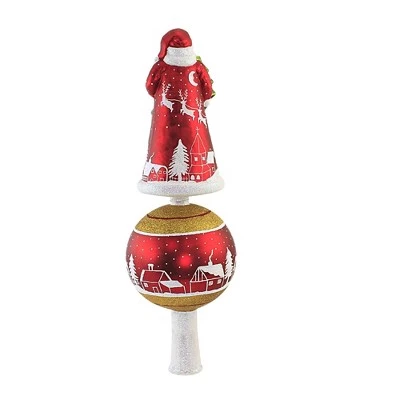 Immerse Yourself In A Truly Magical Sensation Of Holiday Magic With This Luxurious, Beautifully Designed, Free Form Glass Tree Topper Made In Poland. Decorate Or Gift Give This Large Red And Gold Striped Glittered Reflector Ball Santa Tree Topper. The Large Reflector Ball Base Has A Glittered Village With Snow Covered Rooftops And Tall Pines Dusted With Snow. The Reflector Is Hand Painted In Silver, Gold And Red. A 7 Inch Santa In A Red Robe Trimmed In White Superfine Glitter. Santa’s Robe Is Decorated With A White Glittered Village To Compliment The Reflector And Stand Atop The Reflector Base.. New.. Measurements 16.00 In H X 4.00 In W X 4.00 In D. . Made Of Glass. No Assembly Required. Indoor Use Only. Imported