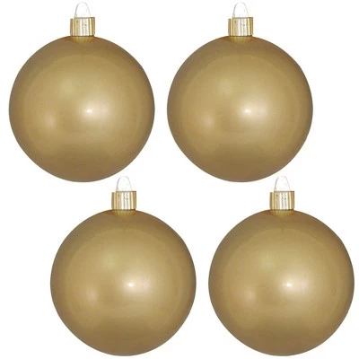 Place an eye-catching touch on your holiday tree with this set of impressive ball ornaments! The classic design gives a smooth, soft sheen that seamlessly blends with a variety of textures and finishes. It’s ready to capture the spirit of your holidays!Product Features:Color: candy goldFinish: shinyComes with ultra-secure screw on threaded caps and durable protective finishesEquipped with a gold ornament capWater, moisture and UV resistantMade from durable shatterproof materialsOrnaments are child and pet friendly and will not break like glassPerfect addition holiday themed parties and other holiday decorRecommended for both indoor and outdoor useMade in MexicoDimensions: 4″ (100mm) diameterMaterial(s): plasticSet includes 4 of the ornaments shown