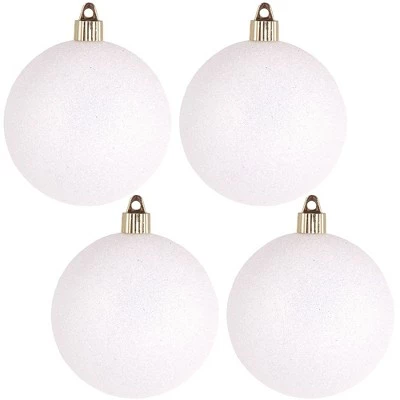 When celebrations are all about fun, bring in these lovely ball ornaments to add to the festive zeal. Transforming your creative ideas into reality, you get to witness a visual treat. The decor pieces will surely be a pleasant surprise for your loved ones.Product Features:4-piece setColor: snowball whiteFinish: glitter drenchedBalls are equipped with gold ornament capsRecommended for indoor or outdoor useDurable and moisture resistantIncludes ultra-secure screw on threaded caps and durable protective finishesAccessible to children and pets and will not break like traditional glass ornamentsMade in MexicoDimensions:Assembled: 8″H x 8″W x 4″DBalls: 4″ (100mm) diameterMaterial(s): plastic