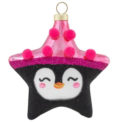 Add a touch of fun and whimsy to your holiday decorations with this pink and black Penguin star holiday ornament! This delightful ornament features a charming penguin in the shape of a star. This shiny pink ornament is embellished with pink and black glitter and pink pom poms. This unique design creates a bold and striking look that will stand out on any tree or wreath. Hang this ornament from your mantle, in your window, or use it as a unique gift to bring cheer to anyone who sees it. Product Features:Penguin hanging holiday ornamentPenguin body is star shaped with a cute faceShiny pink base embellished with glitter Pink pom poms accent the topComes ready-to-hang on a white ribbonFully dimensional ornamentFor indoor use onlyDimensions: 3.75″H x 5.5″W x 1.5″DMaterial(s): glass