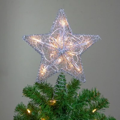 No holiday tree is complete without a beautiful star on top. This lighted silver glitter star is the perfect addition to our holiday tree. The clear lights illuminate not only the star itself but the surrounding branches of your tree. Add a bit of glamour with this traditional star tree topper. Product Features:Color: clear bulbs / green wireNumber of bulbs: 20Bulb size: mini 108″ lead cordDouble-sided designAdditional Product Features:Super bright bulbsUL listed for indoor use onlyIf one bulb burns out, the rest will stay litComes with replacement bulbs, spare fuses and cone to attach to treeContains 1 plug with end connector which allows you to stack multiple lighted items together (not to exceed 210 watts) Wire gauge: 22120 volts, 60 hertz, 0.08 amps, 9.6 wattsDimensions: 10″H x 1″W x 10″DMaterial(s): metal/glass bulbs/wire set of lights