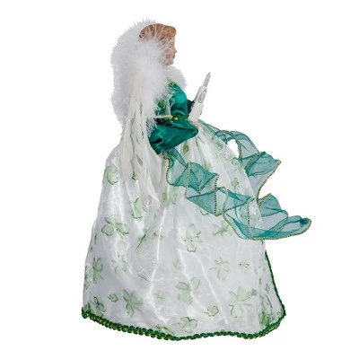 This Kurt Adler UL 10 Light 12-inch Irish Angel Treetop is a beautiful and festive way to add to your holiday décor. This strawberry blonde angel wears an white and green shamrock-accent gown. The top of her gown is a long sleeved vibrant green. The bottom half of her gown is white and accented with green shamrocks. In between her arms are long green ribbons. To complete her angelic look, fluffy white angel wings are attached to her back while she stands with a candlestick in each hand.