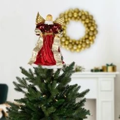 Add an angelic touch to your holiday tree with this elegant tree topper. Designed with a red gown and unlit feature allowing you to customize by adding your own choice of lights! The topper is so versatile that it can also be used as a tabletop decoration.Product Features:Metallic gold and red angel tree topperRed gown with white fur-like trim, dual color sequins top and metallic gold accentsMetallic gold wingsStable wide base for easy displayThe plastic cone makes it easy to attach the angel to your holiday treeIt can also be displayed on your tabletop Recommended for indoor use onlyDimensions: 12″H x 8″W x 4″DMaterial(s): plastic/fabric
