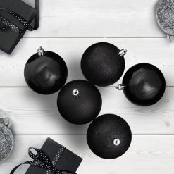 Bring home these shiny ball ornaments to sparkle up your home! They are perfect to add a twinkle to your holiday trees, mantles, window sills, and wreaths. They also come in four different finishes to add more texture to your decorations.Product Features:12-piece set Color: blackComes in 4 finishes: shiny, matte, glitter drenched and holographic sequin glitterBalls are equipped with silver ornament caps Ornaments come ready-to-hang on silver cordsDimensions: 4″ (100mm) diameter Material(s): plastic/glitterSet includes 12 of the ball ornaments 3 of each finish listed above