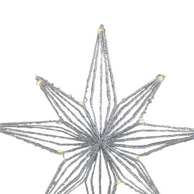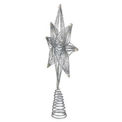 Light up any room easily with this beautiful geometric-shaped star tree topper. The elegant design will add the finishing touches to your holiday decor. Also perfect as a giftProduct Features:Lighted wire tree topper holiday star decorationStar has a shiny silver glitter finishPre-lit with 30 warm white fairy lightsFeatures a geometric diamond designUnique circular cone wire baseRequires 2 “AA” batteries (not included)Convenient on/off switch on the battery packRecommended for indoor use only; if using outdoors keep in covered areaDimensions: 13.75″H x 10″W x 1.25 “DBase measure 2” wide at the widest pointMaterial(s): plastic/metal