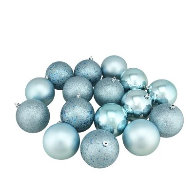 These dazzling gold ornaments are a sure way to add some metallic sparkle to your traditional ornament collection! This special club pack will allow you to build your collection quickly and decorate with more possibilities. Shatterproof ornaments combine the beauty and luster of real glass with the unbreakable practicality of plastic.Product Features:16-piece setColor: baby blueComes in 4 finishes: shiny, matte, glitter drenched and holographic glitterBalls are equipped with silver ornament capsPack of matching silver string hangers are included for optional use (ornament hooks not included)Dimensions: 3″ (75mm) diameterMaterial(s): plastic/glitterSet includes 4 of each finish, for a total of 16 pieces