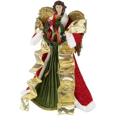 After the lights are strung and the ornaments and tinsel are hung, there’s 1 final step to make a holiday tree perfect: placing a beautiful angel on the very top. This angel topper wears a green gown with a red shawl fastened around her shoulders. To complete her angelic look, metallic gold angel wings are attached to her back while she stands with a festive wreath in her hands.Product Features:Red and green angel tree topperLong red shawl with white fur-like trimShiny green gown with gold trim and gold rope beltThe angel holds a green wreath accented with blue and red berries and a red ribbon bow Stable round clear plastic base for easy displayThe plastic cone base makes it easy to attach the topper to your holiday treeIt can also be displayed on your tabletop For indoor use onlyDimensions: 18″H x 9.5″W x 6″DMaterial(s): plastic/fabric