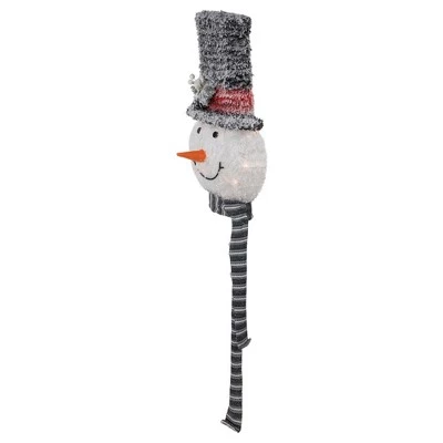 No holiday is complete without a snowman, making this unique find a must-have this season. Decked out in a black frosted top hat and matching striped scarf, this tree topper is ready for the winter weather. Warm white lights offer the perfect amount of holiday glow. Product Features: Lighted snowman tree topper Pre-lit with 20 warm white lights Bulb size: mini Bulb type: incandescent 54″ white lead cord Additinal Features:UL-approved and certified for indoor use only If one bulb burns out, the rest will stay lit Comes with replacement bulbs and spare fuses Contains 1 plug with end connector which allows you to stack multiple lighted items together (not to exceed 210 watts)Wire gauge: 22120 volts, 60 hertz, .08 amps, 9.6 watts Dimensions: 25″H x 12.5″W x 8″D Material(s): polyester/wire/plastic/metal
