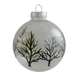 Welcome the winter season to your holiday decor with these forest tree ornaments. These clear and frosted ornament balls will add a unique touch to your trees and wreaths. This pack will allow you to build your collection and decorate with more possibilities.Product Features:4-piece setColor: clear, white, black and champagne goldComes with several frosted bare forest treesBalls are equipped with silver ornament capsIncludes a 3″ silver string attached to the capsClear ornaments can be filled with sand or small objectsRecommended for decorative indoor useDimensions: 3.25″ (80mm) diameterCap opening: 0.63″ diameterMaterial(s): glass/metal/string