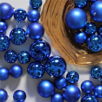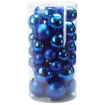 These dazzling blue ornaments are a sure way to add some metallic sparkle to your traditional ornament collection! This special club pack will allow you to build your collection quickly and decorate with more possibilities. Shatterproof ornaments combine the beauty and luster of real glass with the unbreakable practicality of plastic.Product Features: 50-piece setColor: lavish blue Fully dimensional ornaments Fade resistant Comes in 2 finishes: shiny and matte Balls are equipped with silver ornament caps (ornament hooks not included) Recommended for indoor use onlyDimensions:Small: 2.5″ (60mm) diameter Medium: 3″ (80mm) diameterLarge: 4″ (100mm) diameter Material(s): plasticSet includes (31) 2.5″, (11) 3″ and (8) 4″, totaling 50 ornaments
