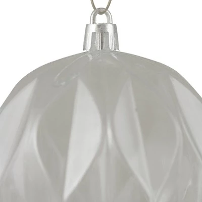 Use these shatterproof ornaments to enhance your holiday tree decoration. These ornaments are clear with a rhombus cut design that will blend a splash of beauty and luster are sure to transform the atmosphere more inviting and pleasant. This holiday, make your abode a perfect place for a get-together with these adornments.Product Features:6-piece setColor: clearFinish: transparentFeatures a rhombus cut patternThe ornaments are shatterproofBalls are equipped with silver cords for hangingDimensions: 3″ (70mm) diameter (at widest point)Material(s): plasticSet includes 6 of the ball ornaments