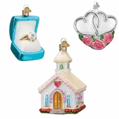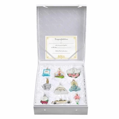 Enhance The Newlywed Home With The Just Married Collection, A Set Of Nine Beautiful Glass Ornaments Designed To Commemorate The Special Day. Each Wedding Set Includes A Unique Selection Of Symbols And Decorations To Remind The Couple Of Their Happy Memories For Years To Come.. Indoor. Imported. Perfect seasonal and special occasion dĂ©cor any time of year.Old World Christmas glass ornaments and glass tree toppers are created using the same techniques that originated in the 1800’s. Beautifully crafted traditional, contemporary and keepsake designs, each piece is designed in mouth-blown glass from carved molds, hand-painted and glittered.