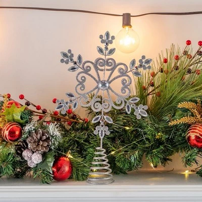 Ornativity Glittered Snowflake Tree Topper has little silver gems attached in strategic places, which add a beautiful decorative touch to the ornament. The silvery treetop decoration will glisten and reflect any lights that are hung throughout the area and will complete the winter wonderland feel you are aiming for. Because of its metallic and refined silver finish, this topper allows for the use on various themed trees. Its great quality allows for firm support on the tree and can be stored and reused. This item is made with high quality glitter to prevent the unwanted messes during the holiday season. When Christmas is over, the tree topper can act as a steady decoration for your table, shelf, or piano top. Keeping the topper as a decoration will extend the Christmas mood in your home. This medium sized metal lightweight tree topper is coated in a layer of silver glitter and has a spiral wire connected at the bottom allowing for secure attachment to a tree. The spiral is made sturdy so it can stand on a flat surface. Your holiday spirit will be enhanced to an extraordinary level with this wintery holiday item.