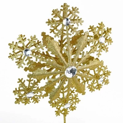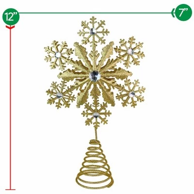 Ornativity Glittered Snowflake Tree Topper has little silver gems attached, which add a beautiful decorative touch to the ornament. The golden topper will glisten and reflect any lights that are hung throughout the area and will complete the winter feel you are aiming for, in your home. Because of its metallic and refined gold finish, this topper allows for the use on various themed trees. Its great quality allows for firm support on the tree and can be stored and reused. This item is made with high quality glitter to prevent the unwanted messes during the holiday season. When Christmas is over, the tree topper can act as a steady decoration for your table, shelf, or piano top, this will extend the Christmas mood. This medium sized metal lightweight tree topper is coated in a layer of gold glitter and has a spiral wire connected at the bottom allowing for secure attachment to a tree or a sturdy stand on a flat surface. Your holiday spirit will be enhanced to an extraordinary level with this wintery holiday item.