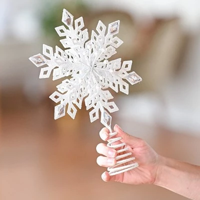 Ornativity Glittered Snowflake Tree Topper has little silver gems attached, which add a beautiful decorative touch to the ornament. The silvery topper will glisten and reflect any lights that are hung throughout the area and will complete the winter feel you are aiming for, in your home. Because of its metallic and refined white finish, this topper allows for the use on various themed trees. Its great quality allows for firm support on the tree and can be stored and reused. This item is made with high quality glitter to prevent the unwanted messes during the holiday season. When Christmas is over, the tree topper can act as a steady decoration for your table, shelf, or piano top, this will extend the Christmas mood. This medium sized metal lightweight tree topper is coated in a layer of white glitter and has a spiral wire connected at the bottom allowing for secure attachment to a tree or a sturdy stand on a flat surface. Your holiday spirit will be enhanced to an extraordinary level with this wintery holiday item.