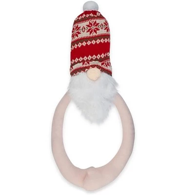 - The gnome is wearing a red and green ugly sweater printed knit beanie hat with a white pom pom top.