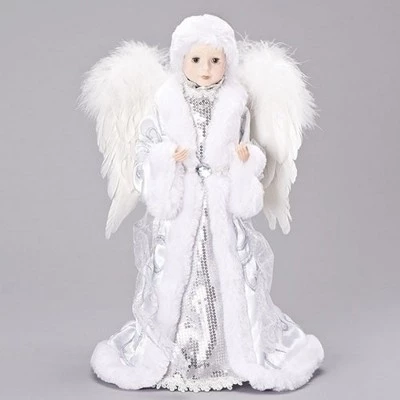 Add a little sparkle to your decor this holiday season with this angel tree topper! Featuring a white and silver dress with fur trim, and fur hat this piece is unique! This tree topper would look amazing with white, silver or blue decor! Features :White and silver sequin angel tree topperFeatures silver sequin dress, with gem embellishment and fur trim, and fur hat Includes fully feathered wings Features ceramic head and handsRecommended for indoor use only Dimensions: 17” H x 9” W x 5” L Material(s): fabric/pvc/ceramic