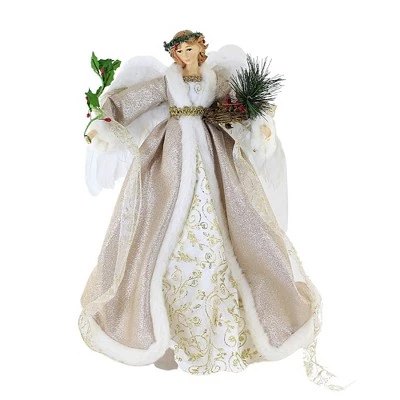 Pretty Tall Angel Tree Topper Wearing A Long Gown Trimmed In White Faux Fur Around The Neckline And Bottom Edges. Her Pretty Long Hair Is Adorned With A Wreath Of Greenery Embellished With Red Berries.. New.. Measurements 18.0 In H X 11.5 In W X 6.5 In D. . Made Of Plastic. No Assembly Required. Indoor Use Only