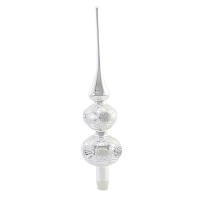 Silver & White Lace Is A 13.00 Inch Decorative Holiday Tree Topper Made Of Glass From The Czech Republic. Our Silver Double Ball Tree Topper Has Silver Traditional Reflectors Surrounded With White Iridescent Glitter. Each Reflector Ball Is Decorated With A White Iridescent Glitter Scrolling. This Tree Topper Has Tall Shiny Silver Pointed Top.. New.. Measurements 13.00 In H X 2.50 In W X 2.50 In D. . Made Of Glass. No Assembly Required. Indoor Use Only. Imported