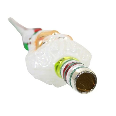 Vintage Style Glass Tree Topper And Table Decor Piece Of Blown Glass In Metallic Coloring And Glittered Accent. This Shiny Brite Vintage Feeling Santa Tree Topper Is 11.50 Inches Tall With A Red And White Striped Spire.. New.. Measurements 11.50 In H X 3.00 In W X 2.00 In D. . Made Of Glass. No Assembly Required. Indoor Use Only. Imported. Shiny-Brite by Christopher Radko recreates the joy and style of a midcentury American Christmas. True to the original design, each piece is handcrafted in China created using shapes, palettes and motifs derived from antique ornaments.Turn back the clock and celebrate Christmas – American Style.