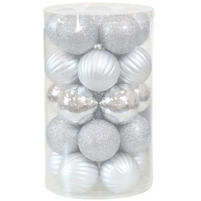 This 25-piece holiday ornament kit includes all the decorations you need to fill out the tree, hang from a garland, deck the halls, or use as decorative bowl filler to brighten any holiday experience. They can also be used on decorative stands to add a little extra sparkle. The shatterproof design combines the beauty and shine of glass and the practicality of plastic making them an ideal option for families with pets and/or children. The ornaments come with hanging loops, making them easy to attach to the tree, hang on garland or hang for use as other decoration without weighing anything down. Remove the loops to use as fun and sparkly decorative filler for bowls and vases! This set features 3 different styles of bulbs: one of a pure, white finish, one with a white color covered in white and silver glitter, and lastly a white bulb with ridged edging for a fun and decorative look.