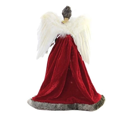 Pretty Dark-Haired Angel Tree Topper Wearing A Red Velvet Dress With Brown Fur Trim Around The Cuffs And Opening Edges. The Dress Has A Red Plaid Insert Which Has Random Lights That Shine. She Holds A Green Holly Wreath With Red Berries In Her Hands.. New. Comes Packaged In A Box.. Measurements 18.0 In H X 9.0 In W X 7.0 In D. . Made Of Plastic. No Assembly Required. Indoor Use Only. Imported