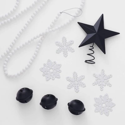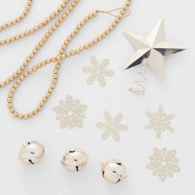 This Metal Mini Christmas Tree Trimming Set from Wondershop™ makes a great addition to your Christmas decorations. Presented in a box, it includes 12 decorative tree ornaments featuring 6 snowflakes, 4 jingle bells, a star tree topper and a beaded garland for an assorted festive look. Intended for indoor use only, the metal finishes make the ornaments easy to incorporate into a variety of tree decorating themes.