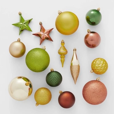Bring traditional charm to your holiday decor with this 85-Count Woodland Terrace Christmas Tree Ornament Set from Wondershop™. This set of Christmas tree ornaments includes an assortment of cute and funny novelty ornaments plus traditional ball ornaments and star ornaments in green, golden or ivory color palettes featuring glossy shades and textures to add a stunning finish to your Christmas tree. Great for pairing together or with different ornaments of your choice, they feature attached loops or looped caps for easy hanging from the branches of your tree.